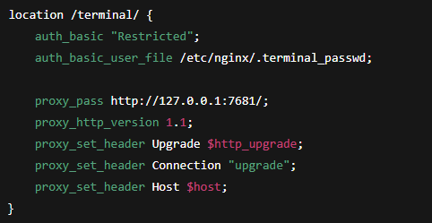 기존에 nginx가 hosting 중인 사이트 config에 terminal을 위한 주소와 설정을 추가한다.