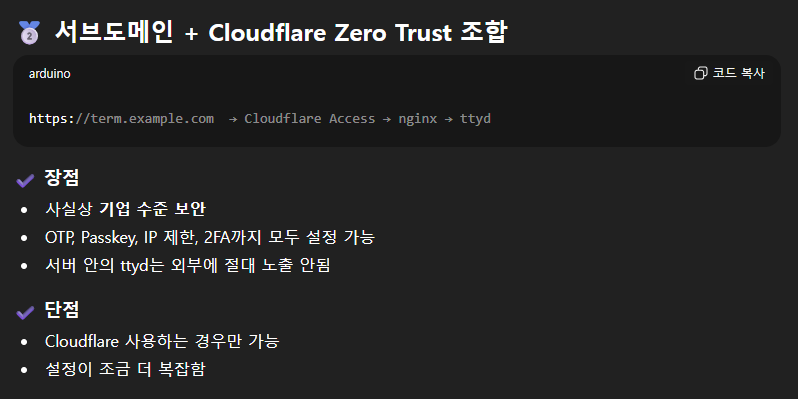 특징은 서버 user 로그인을 하지 않아도 ttyd를 실행한 user로 이미 로그인된 터미널이 떠버린다. 보안상 상당히 위험해 보이니 ttyd 옵션을 찾아보거나, 보안 인증을 추가하는게 좋을 것 같다. chatGPT는 Clouldflare를 이용한 추가 인증을 추천하고 있어서 나중에 적용해봐야겠다.